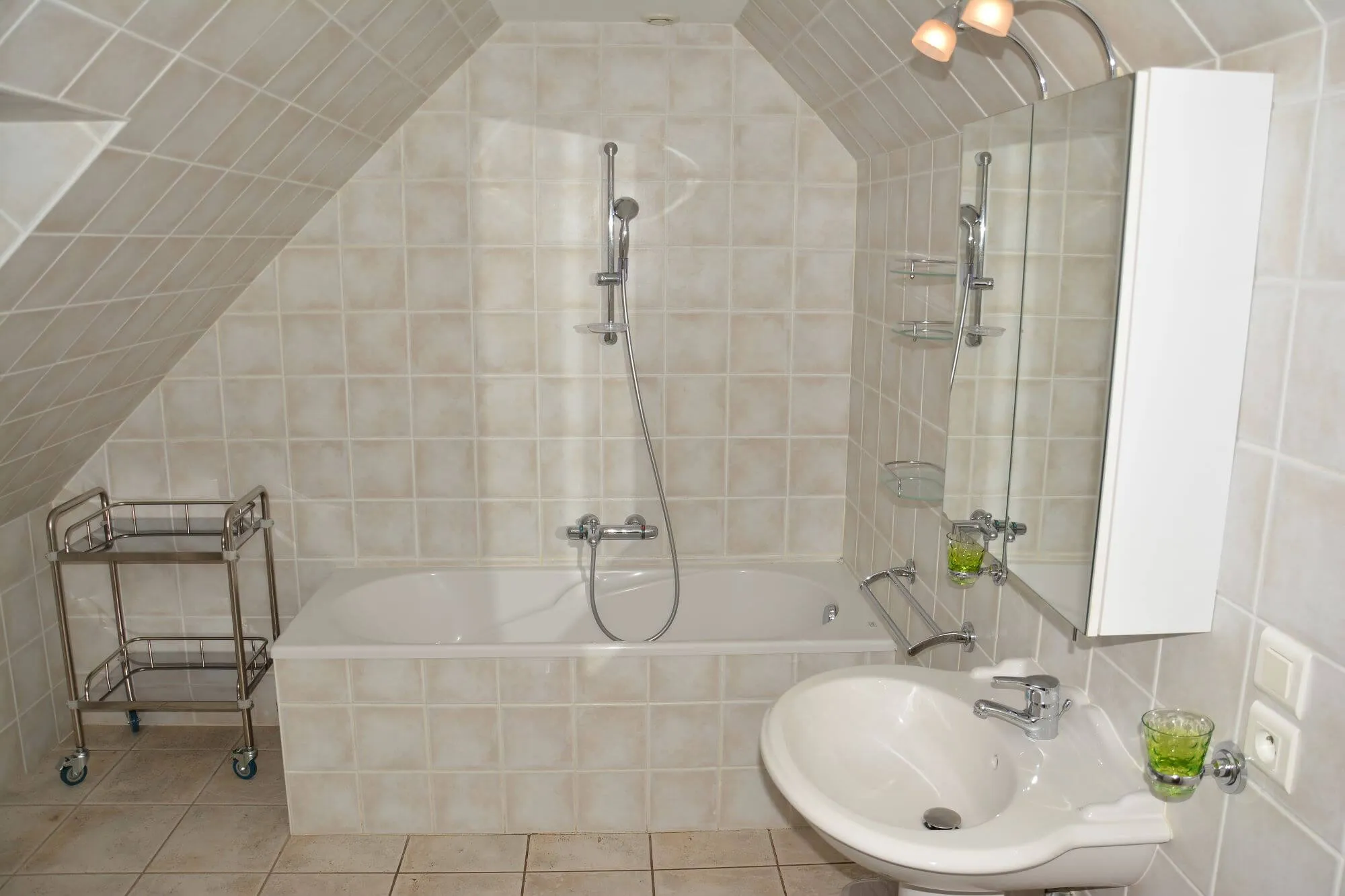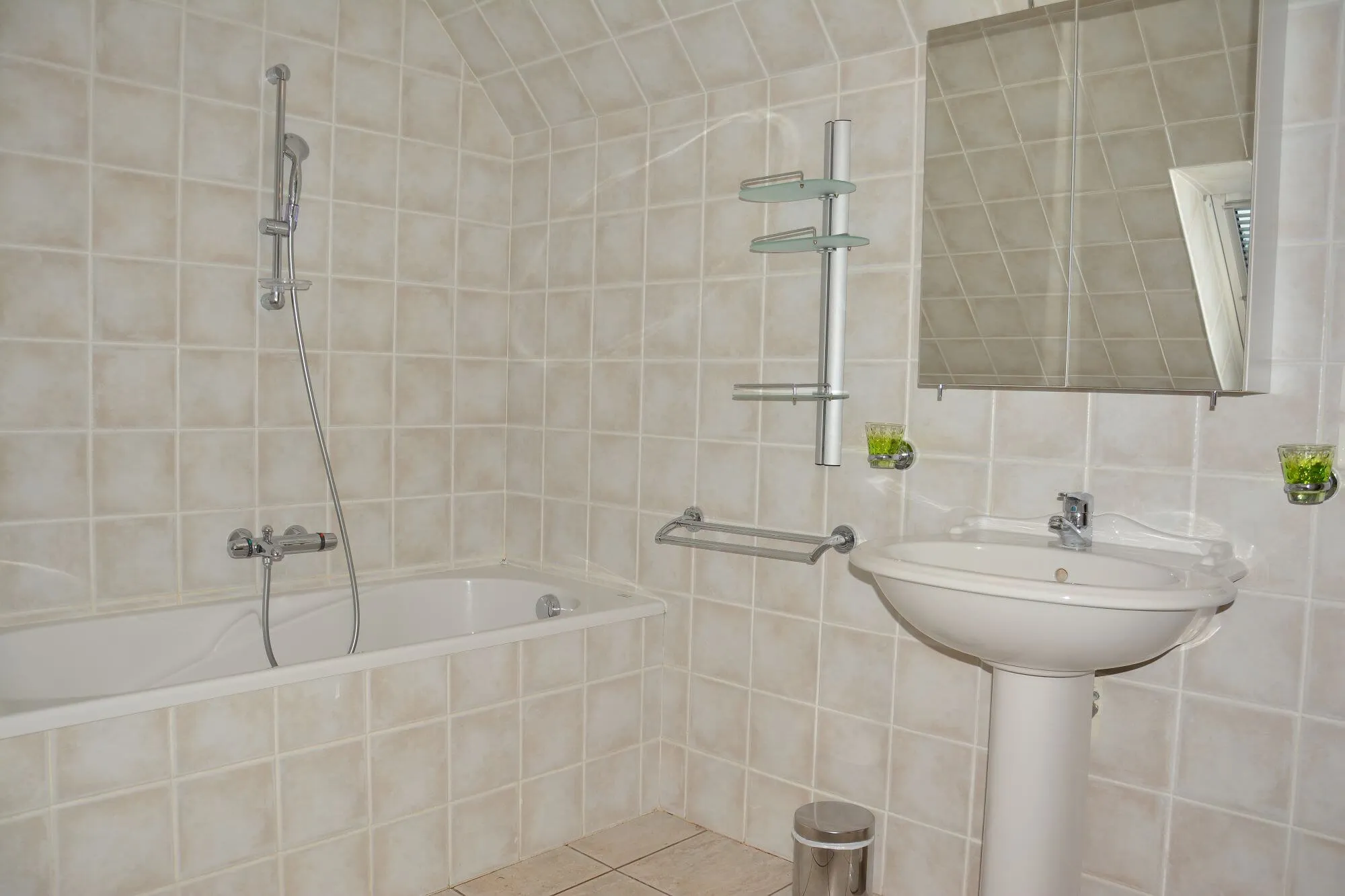 ✓ 1 salle de bain est située à l'étage. Elle est composée d'une grande baignoire, d'un lavabo sur colonne, d'un meuble miroir, de petits rangements complémentaires et d'un chauffage soufflant ;