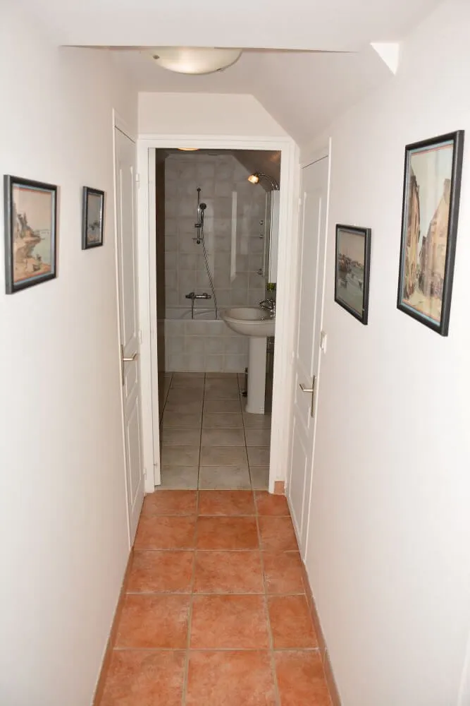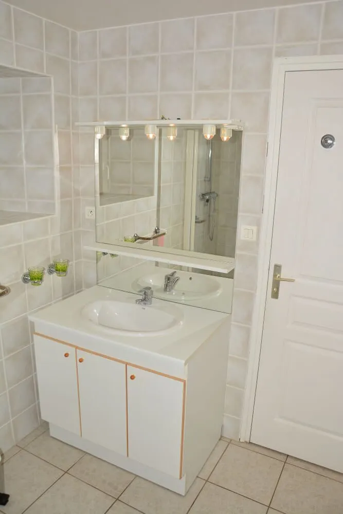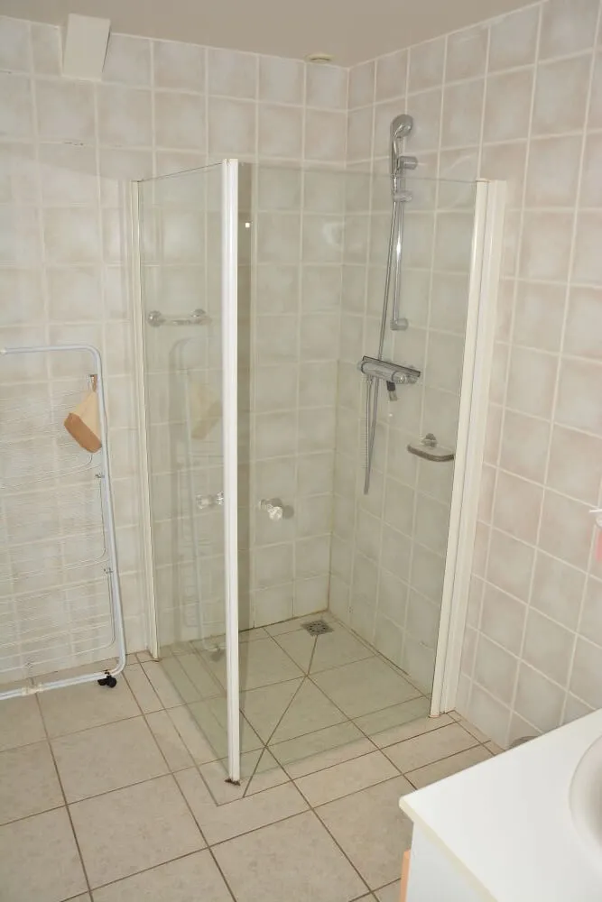 ✓ 1 salle de douche est située au rez-de-chaussée. Elle est équipée d'une douche à l'italienne de 90 x 90 cm, d'un meuble vasque et de petits rangements ainsi que d'un sèche -cheveux et d'un chauffage soufflant ;