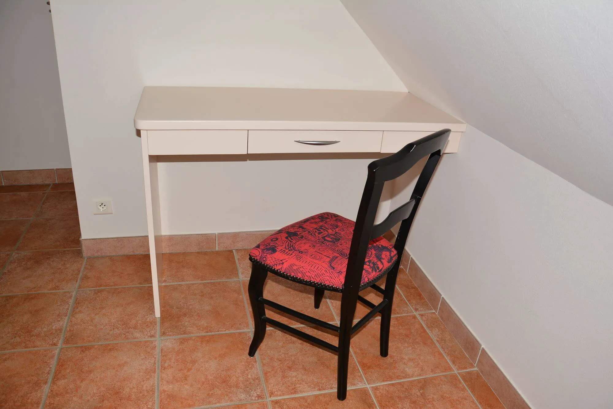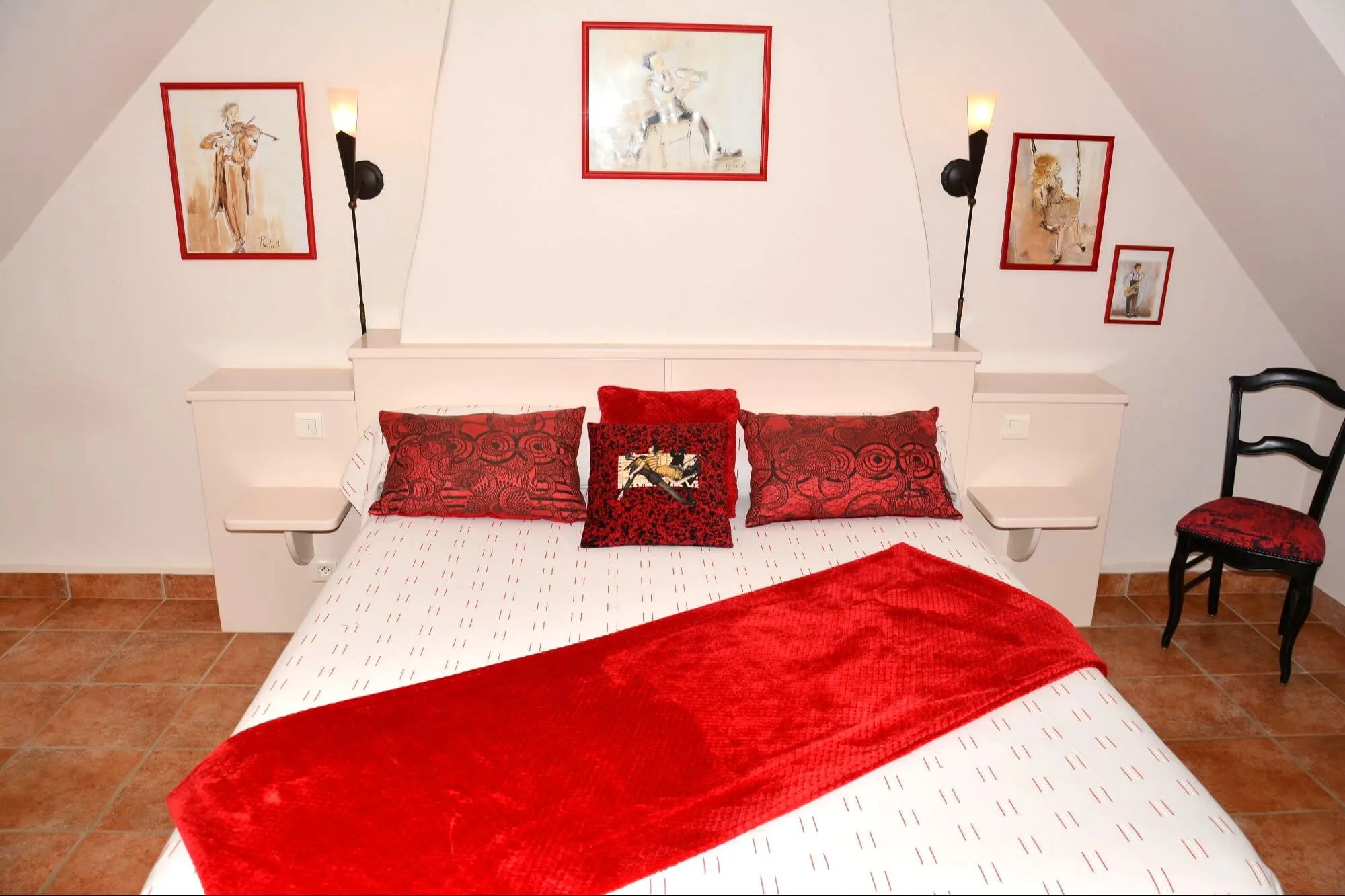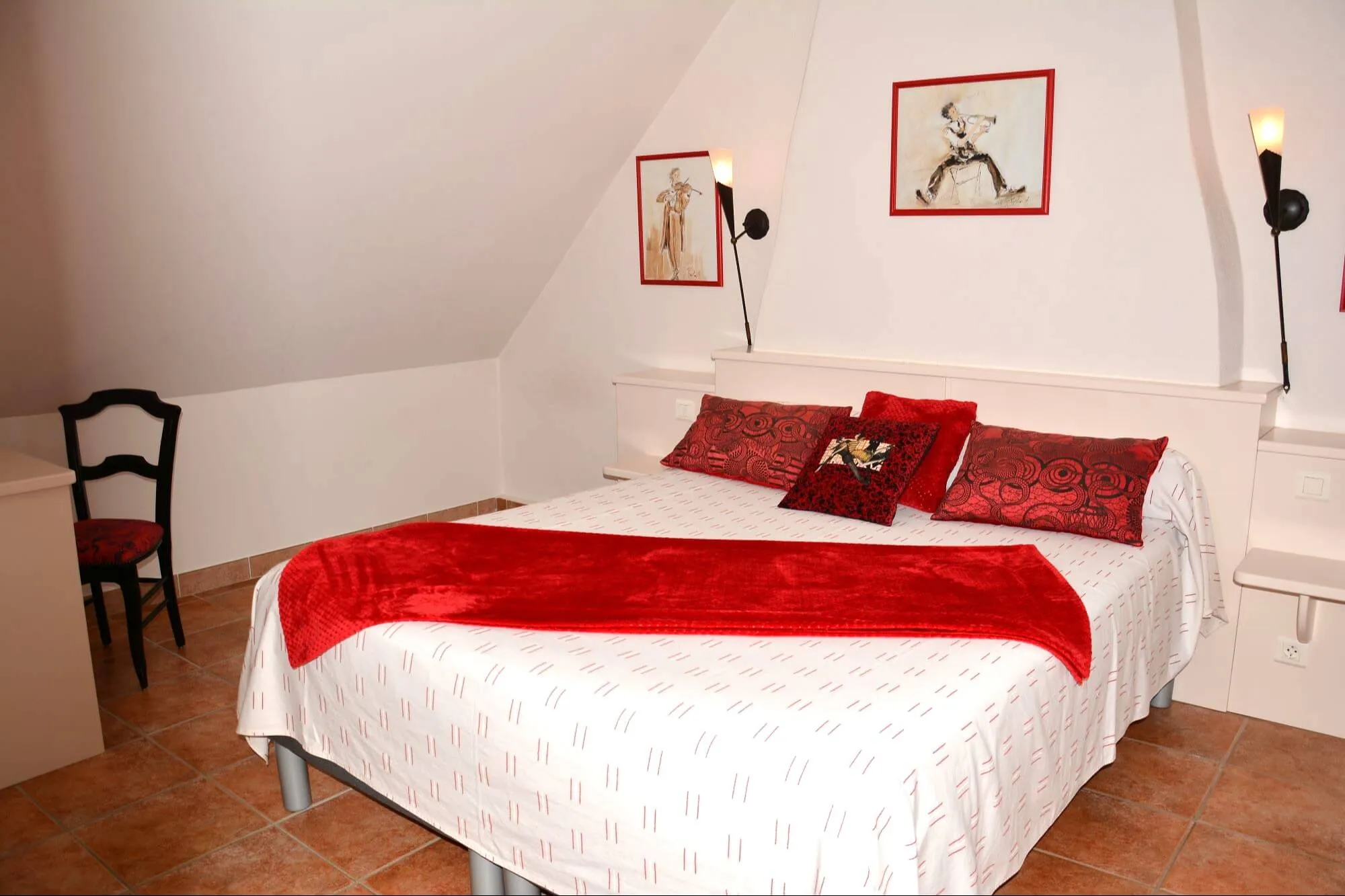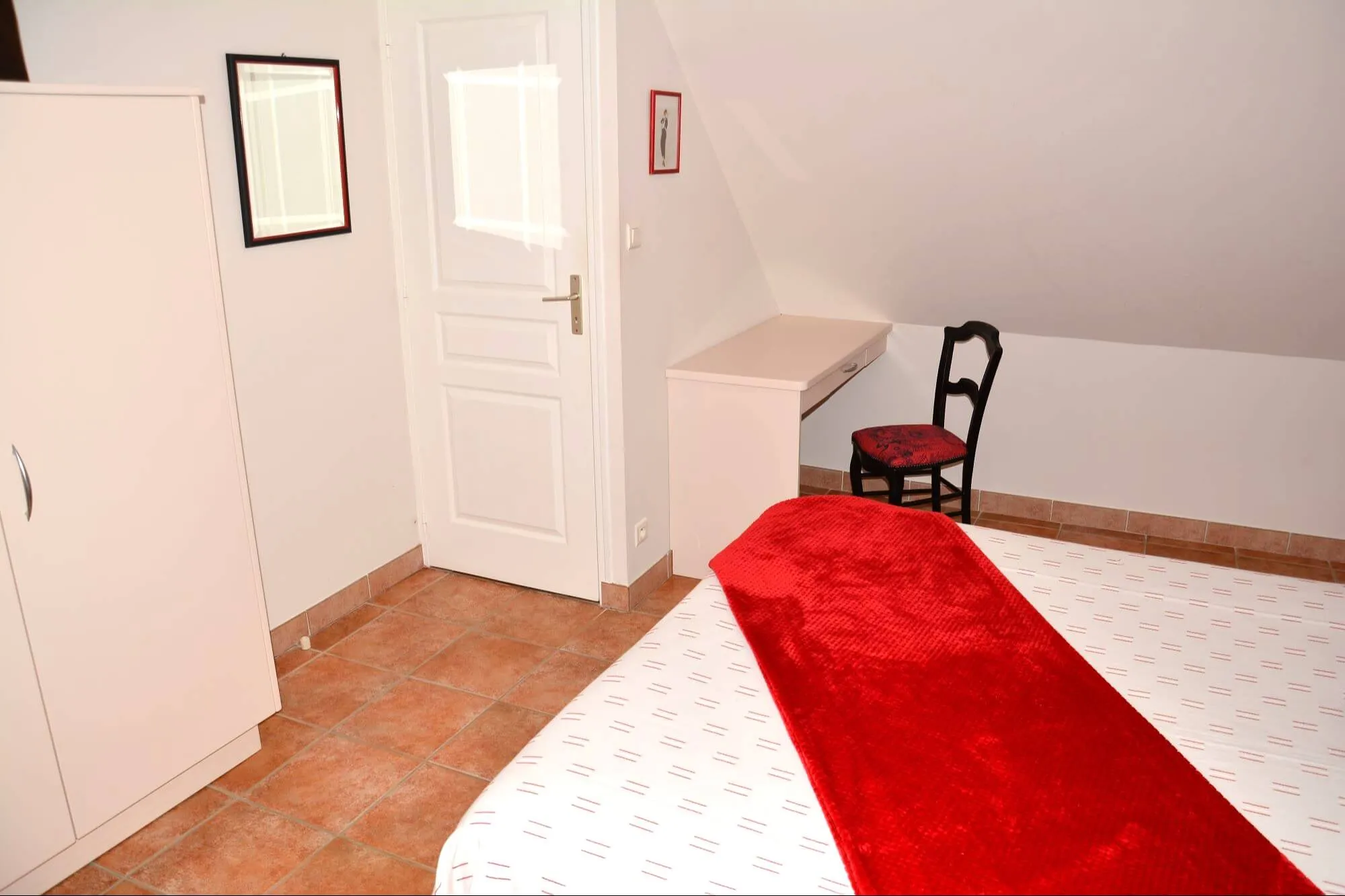 ✓ la chambre rouge est équipée d'1 lit double de 160 x 200 cm. Ce lit et divisible en 2 lits de 80 x 200 cm. Elle est équipée d'un placard aménagé avec de nombreux rangements et d'un bureau ;