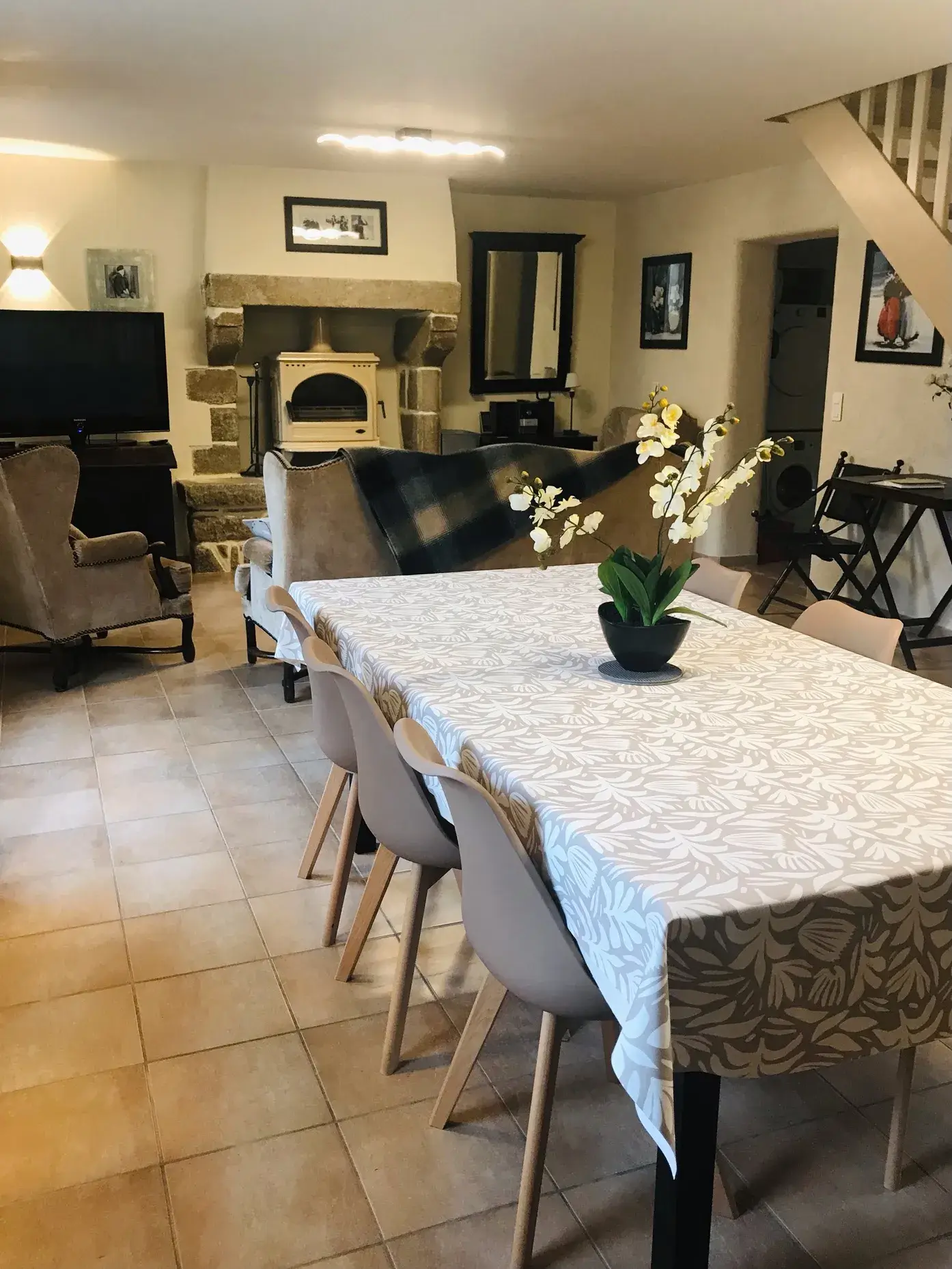 Le gîte anis bénéficie d'une grande pièce de vie avec un espace salle-à-manger de 8 places. Dans la même pièce, le séjour est équipé d'un espace de télévision avec ensemble canapé et fauteuils. Une ancienne armoire bretonne trône dans la pièce. Dans l'ancien insert de cheminée est disposé un poêle à bois qui permet aux clients de se chauffer en saison automnale et hivernale. Le séjour comprend :