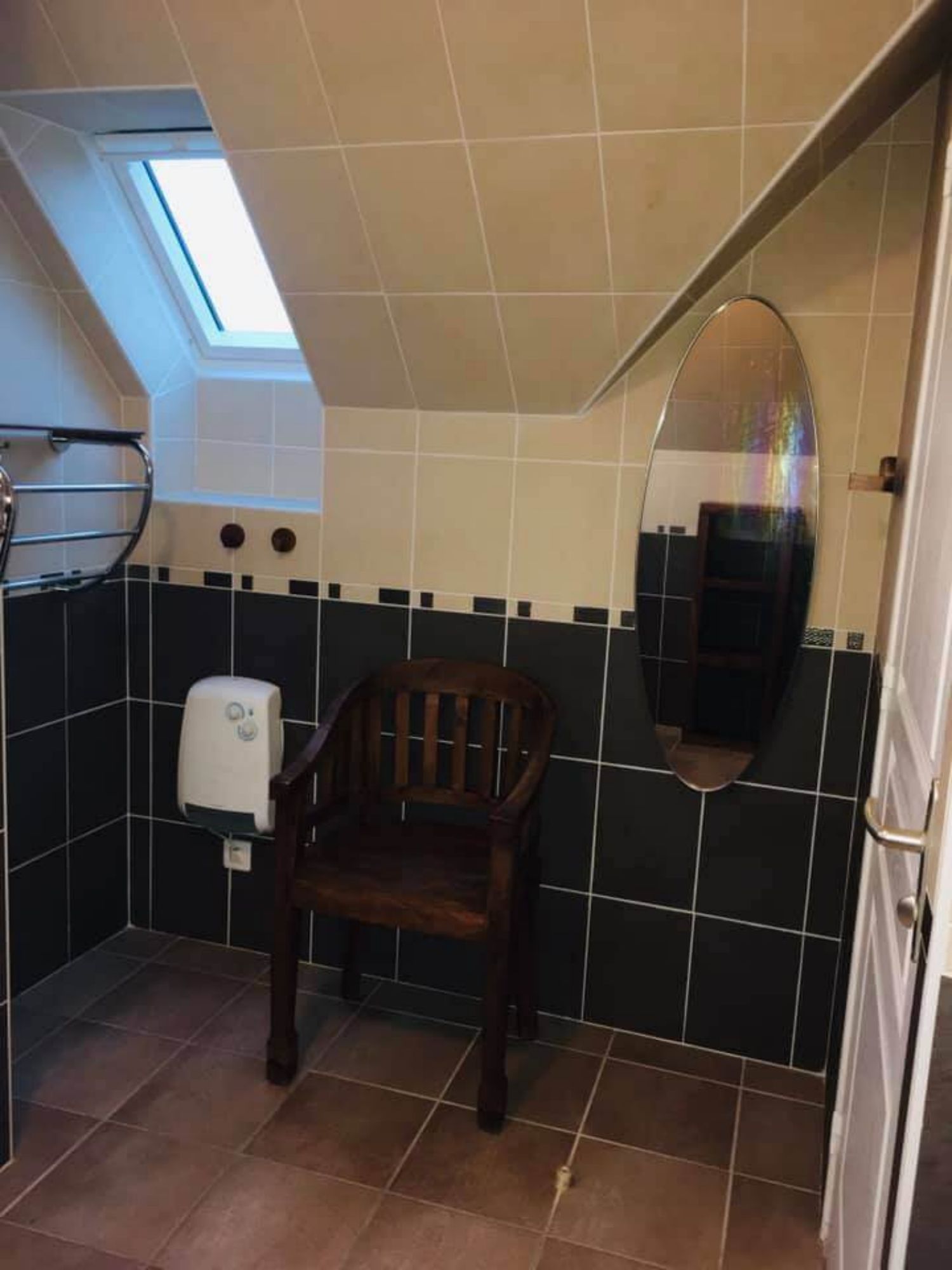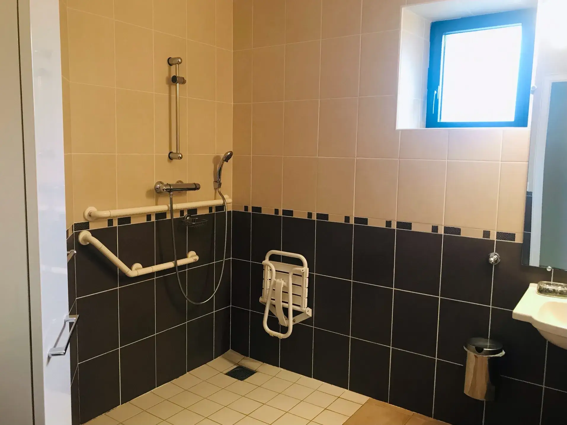 ✓ 1 salle de douche privative à la chambre , et accessible aux PMR est située au rez-de-chaussée. Elle est composée d'1 grande douche, d'1 lavabo et d'1 placard de rangement ainsi que d'1 sèche-cheveux et d'1 chauffage soufflant ;