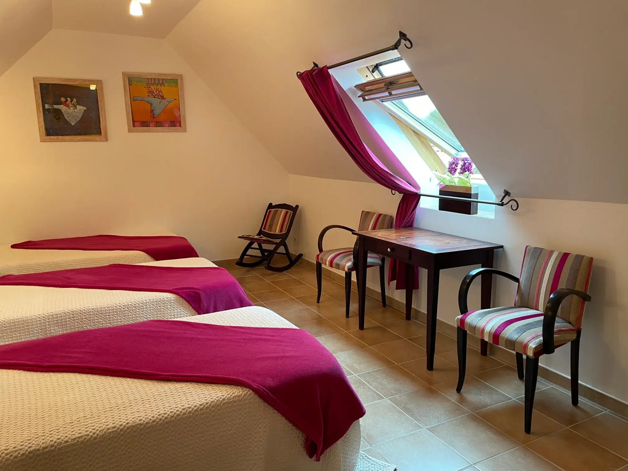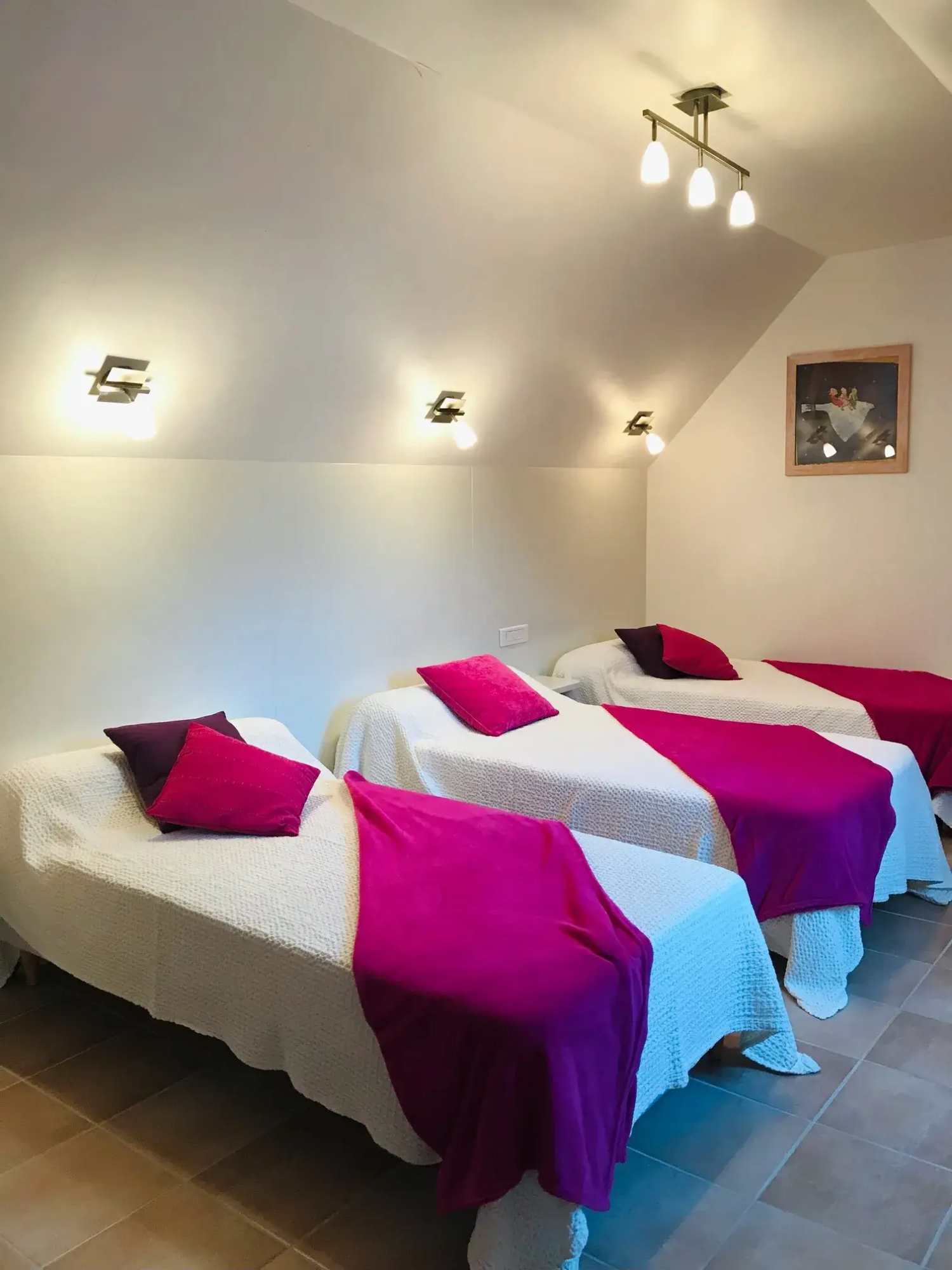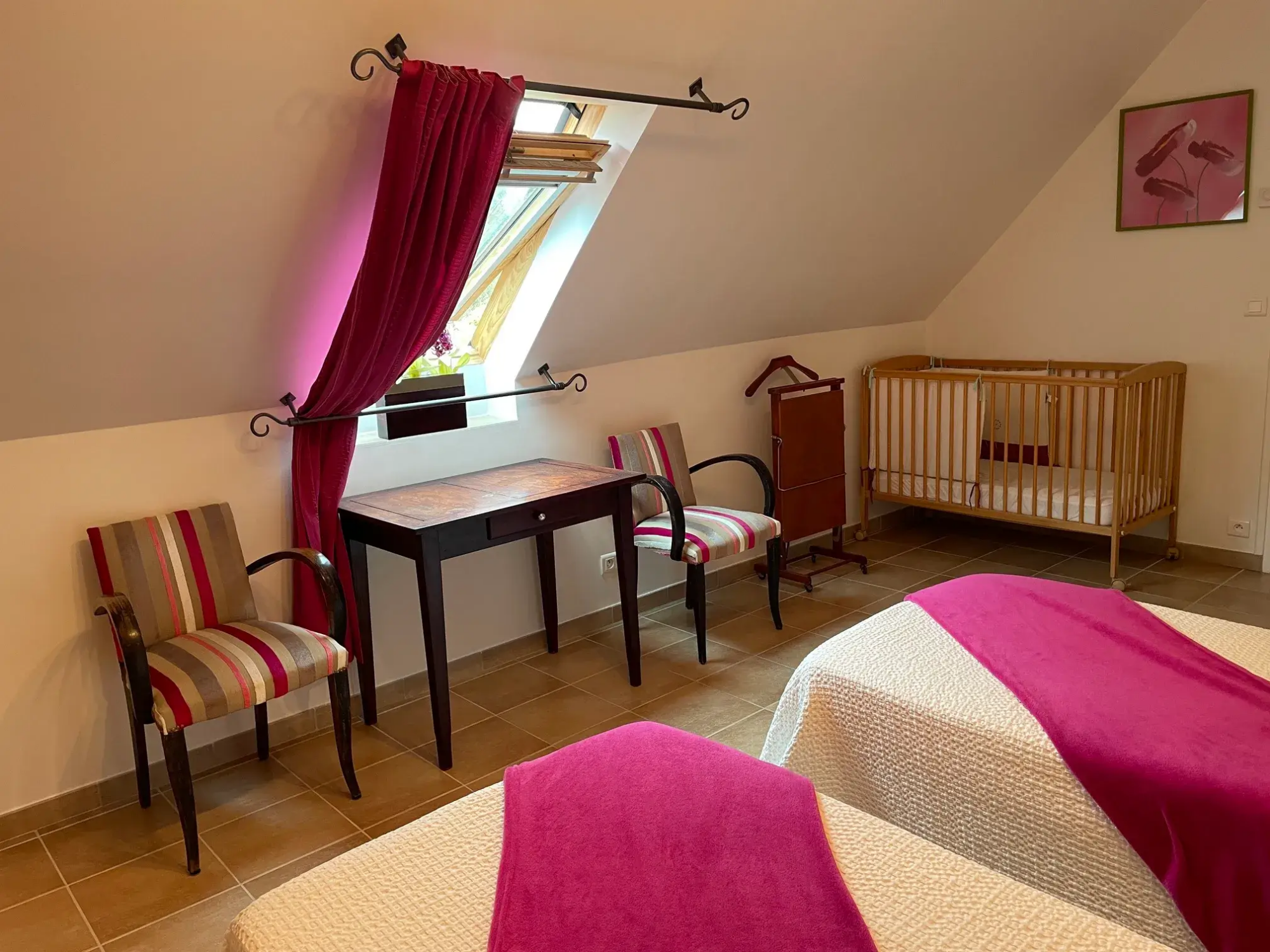 ✓ 1 chambre rose à l'étage avec 3 lits simples de 90 x 200 cm (ou 1 lit King size de 180 x 200 cm + 1 lit simple de 90 x 200 cm), 1 placard aménagé, 1 bureau ;