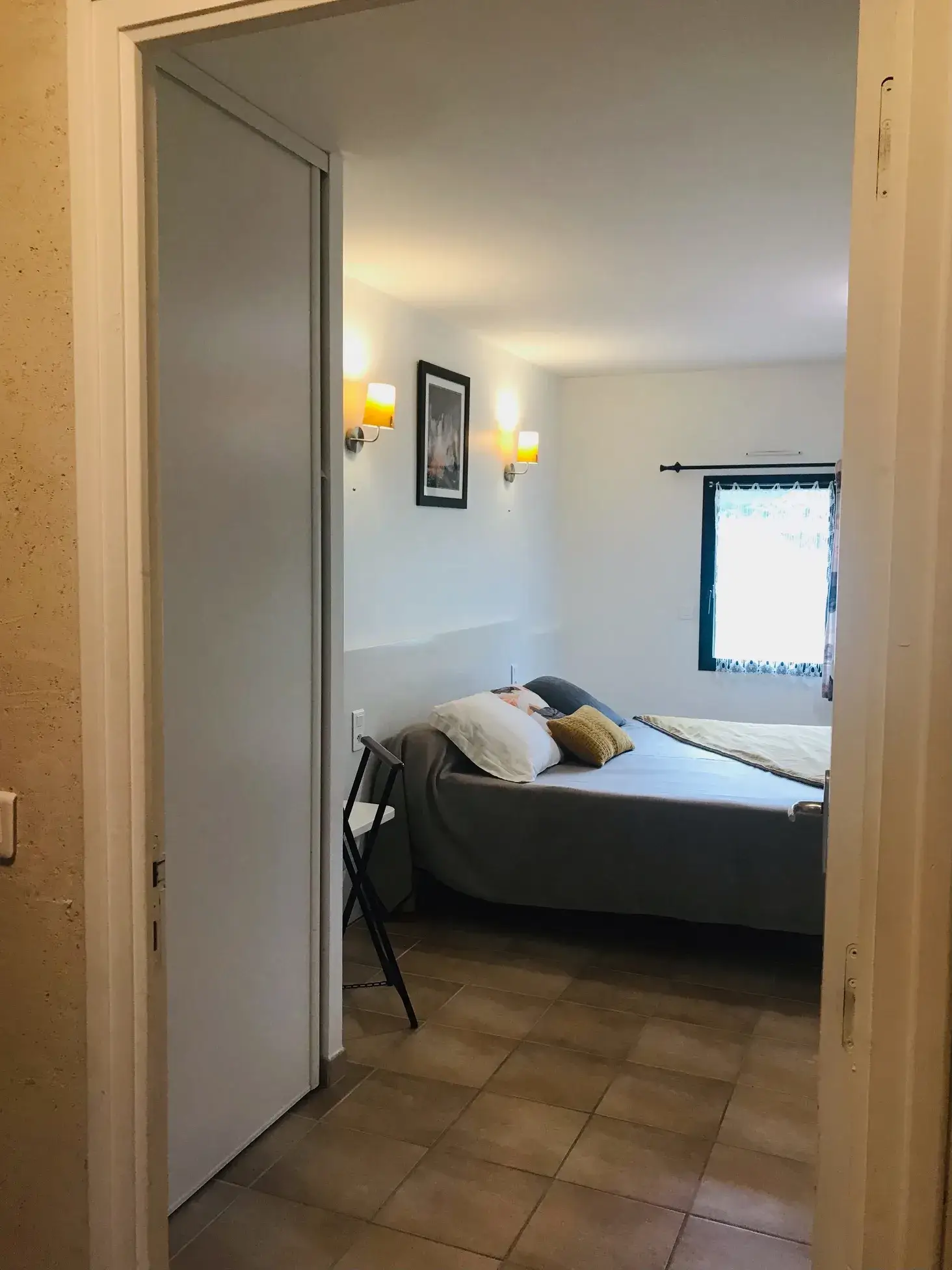 ✓ 1 chambre au rez-de-chaussée accessible PMR dispose d'1 lit double de 160 x 200 cm. Elle est équipée d'1 placard aménagé avec de nombreux rangements ;