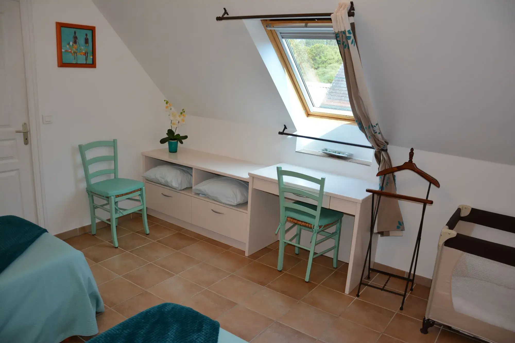 " Le gîte turquoise est l'hébergement idéal pour découvrir en couple ou en famille les merveilles des Monts d'Arrée et de Huelgoat. Il s'agit d'un gîte qui a été construit en 2008, il a été pensé pour le rendre le plus fonctionnel possible notamment si vous venez en deux couples ou avec des adolescents désireux d'avoir leur indépendance. En effet, ce penty peut être scindé en 2 espaces privatifs avec 1 chambre, 1 salle de bain et 1 WC à chaque étage. Pour votre confort, le gîte dispose d'équipements de qualité, notamment d'un plancher chauffant par géothermie à chaque niveau, puis à chaque pièce d'un thermostat. La superficie de cet hébergement est de 95 m², il peut accueillir jusqu'à 4 personnes et un bébé. "