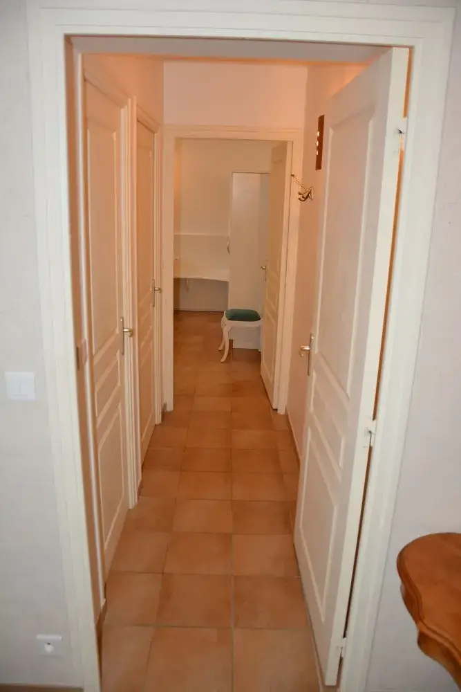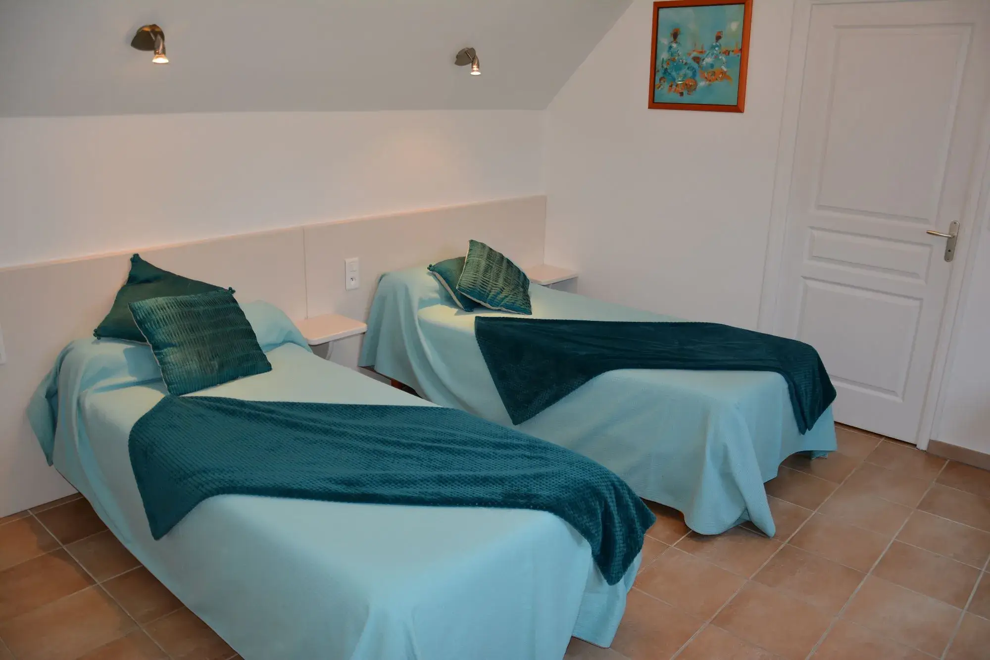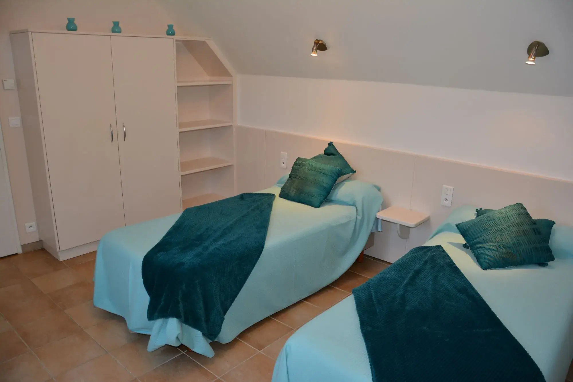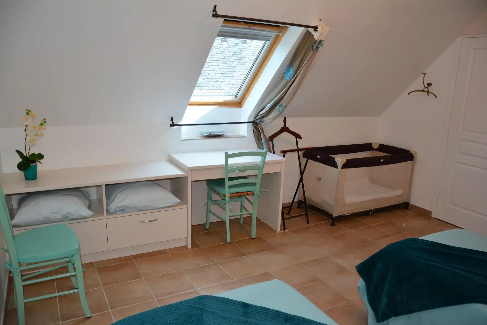 ✓ 1 chambre à l'étage propose 2 lits simples de 90 x 200 cm, 1 lit parapluie, 1 placard aménagé, de nombreux espaces de rangements et d'1 bureau. La chambre donne directement accès à une salle d'eau attenante avec WC suspendu ;
