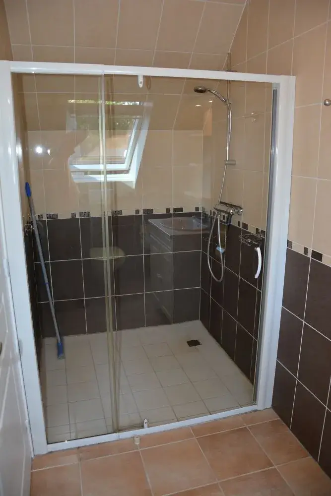 ✓ 1 salle de douche privative est située à l'étage. Elle est composée d'une très grande douche à l'italienne, d'un meuble vasque, d'un WC suspendu et d'un chauffage radiant ;