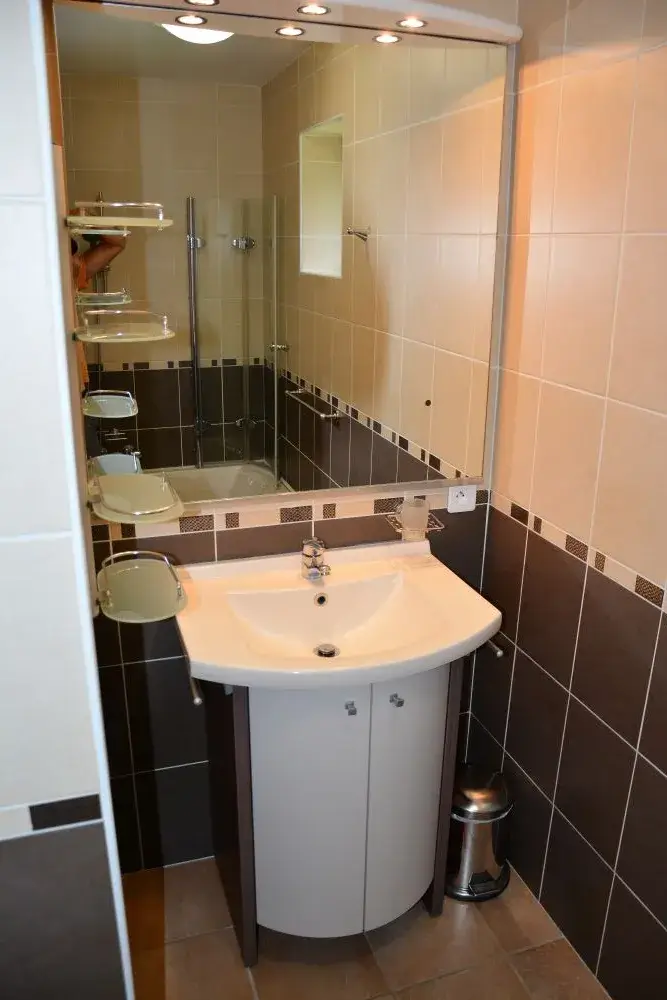 ✓ 1 salle de bain est située au rez-de-chaussée. Elle est composée d'une grande baignoire avec pare-douche, d'un meuble vasque et de petits rangements ainsi que d'un miroir tactile et d'un chauffage radiant. Un sèche-cheveux est également à votre disposition ;
